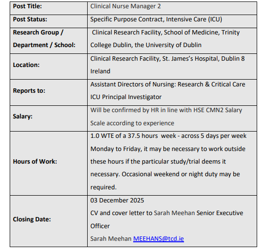 - Clinical Nurse Manager II: The CNM II with a special interest in audit and quality improvement will be responsible for the coordination of data collection within the theatre department. The post holder will ensure that operational, clinical, and safety data are accurately captured, analysed, and utilised to drive improvements in patient care, efficiency, and compliance with national standards. The successful candidate will liaise with clinical investigators to implement protocols within the clinical setting.